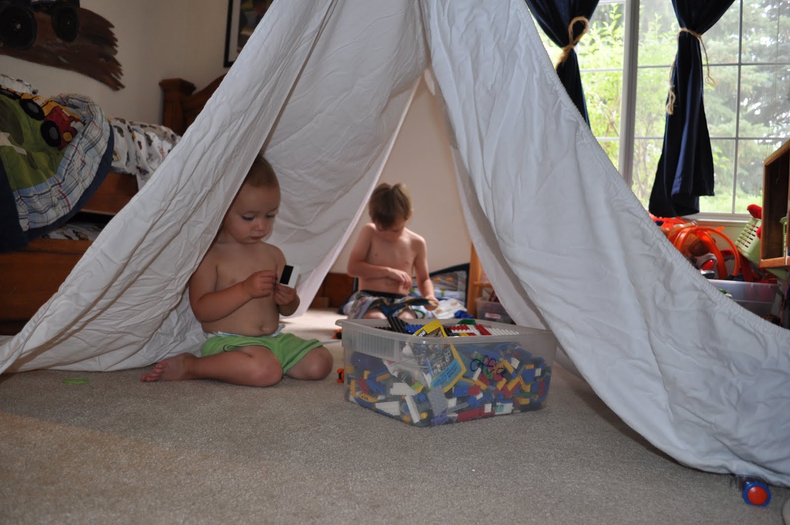 In my attempt to be a "cool" mom, I made the boys a tent in their room for them to play Legos, read books, and do QUIET things. Although a far-fetched goal, I pursued it without abandoned. It turned out quite to my satisfaction but of course, the boys saw uses for it other ways. However, they did use it for it's intended purpose albeit for 7 1/2 minutes. But I will take what I can get!